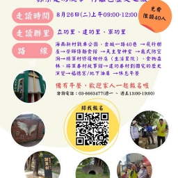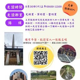 走讀時間:114年8月26日(二)上午09:00-12:00 活動費用:免費,需全程參與者,限額40人,額滿為止 報名網址:https://www.beclass.com/rid=30500bb689982ee04ad9 以上活動,請詳閱「報名須知」 ,願意完全遵守才報名。 ★主辦單位:新竹市東區區公所 ★承辦單位:新竹市科學城社區大學 ★聯絡資訊:03-6663477,(週一~週五上班時間1...