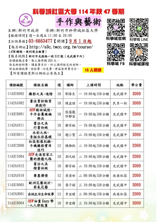【 114秋課程推薦】新竹市科學城社區大學【手作與藝術系列課程】