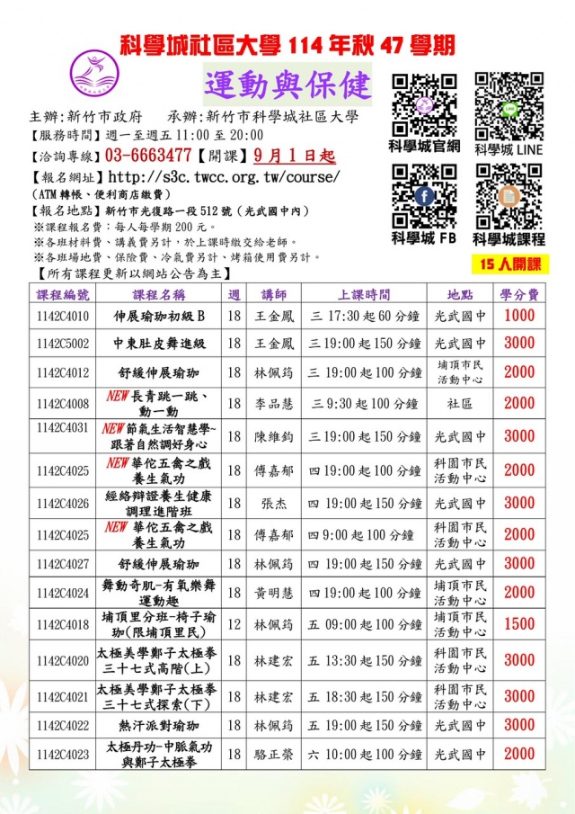 【 114秋課程推薦】新竹市科學城社區大學【運動與保健系列課程】【生活與職能系列課程】【走讀與行旅系列課程】