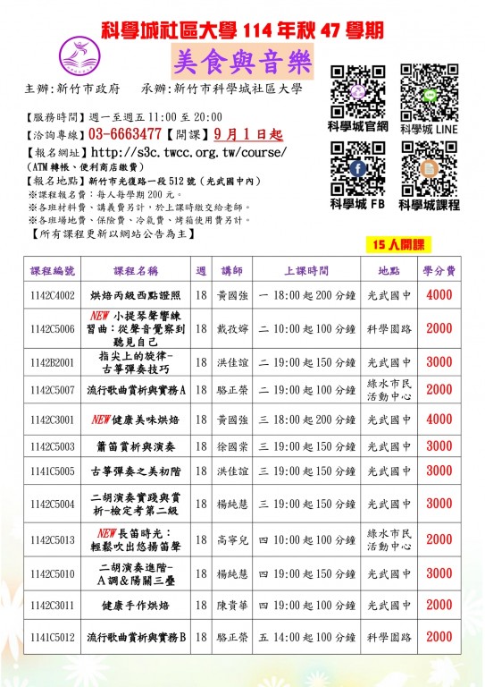 【 114秋課程推薦】新竹市科學城社區大學【美食與音樂系列課程】 【資訊與語文系列課程】