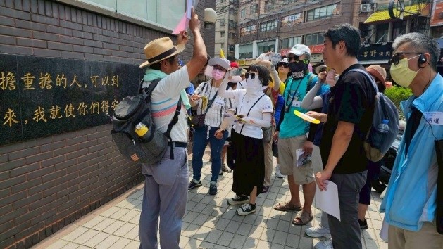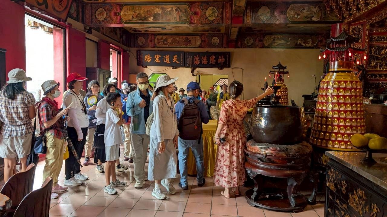 隨後由科學城社大導覽老師塗夢龍接棒,依序介紹基督教勝利堂、忠貞新村、天宏宮(蔣公廟)、寡婦樓與汀埔圳。基督教勝利堂建於1954年,由美國宣教士創立,在戰後動盪時期以信仰安撫人心,成為新竹地區重要的宗教與精神寄託場所;天宏宮由廟方人員親自導覽介紹,認識廟內供奉的瑤池金母、玉皇大帝以及多座蔣公銅像,感受當年榮民與眷屬對歷史人物的情感連結。而「寡婦樓」則以特殊的「屋中屋」建築形式,見證戰後居民堅韌的生活樣貌,讓學員深受觸動。