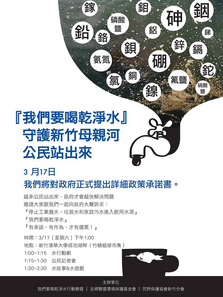 「我們要喝乾淨水行動聯盟」自 2017 年 11 月底發動連署,已累績近萬份連署。新竹縣市民眾非常希冀,作為飲用水源的頭前溪水質能改善:工業廢水、垃圾水及家庭污水不再污染河川。整治河川污染,需要新竹縣市政府共同合作處理。