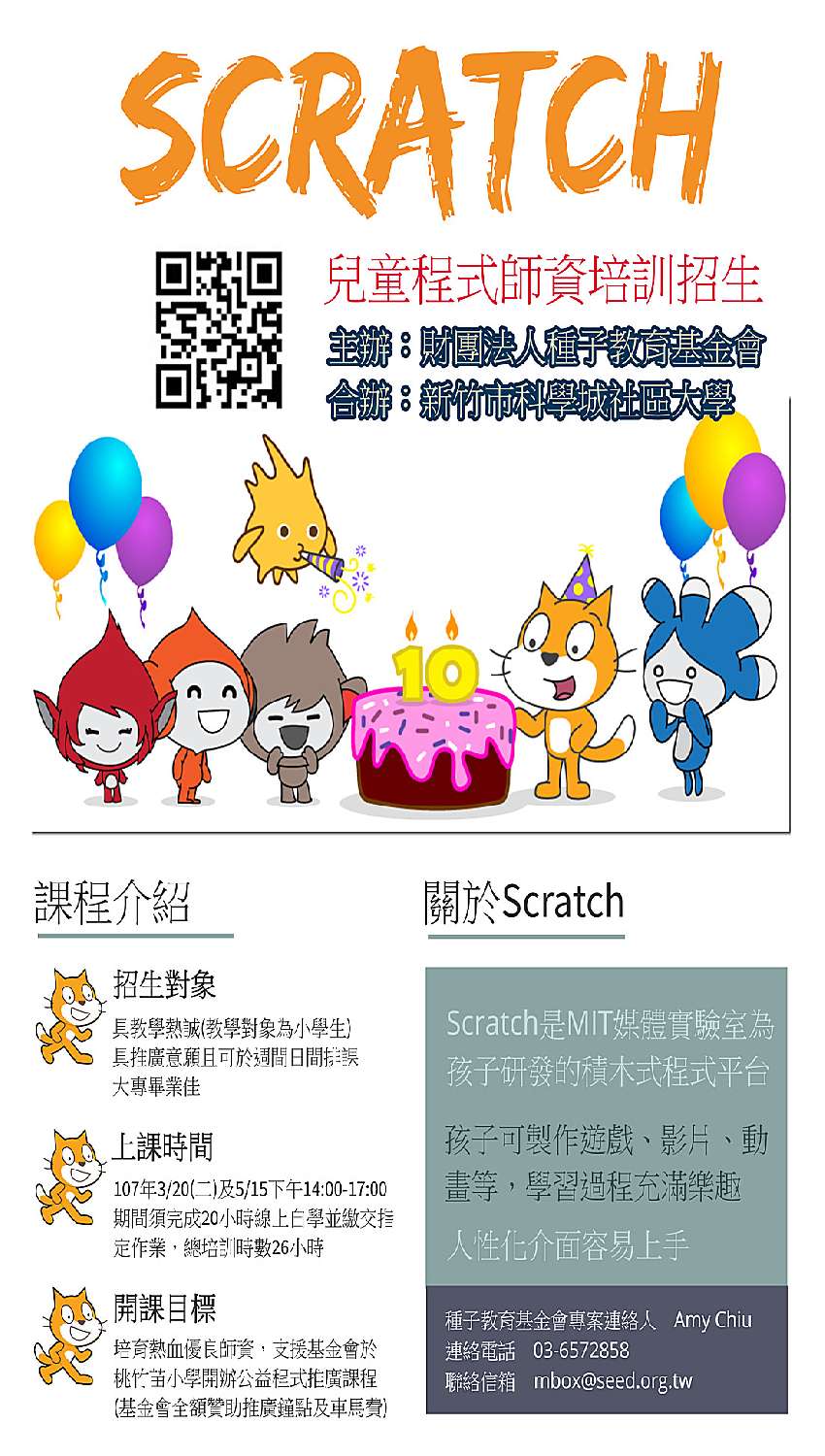 107兒童程式設計種子師資培訓活動歡迎報名,本活動由財團法人種子教師基金會主辦、新竹市科學城社區大學合辦。